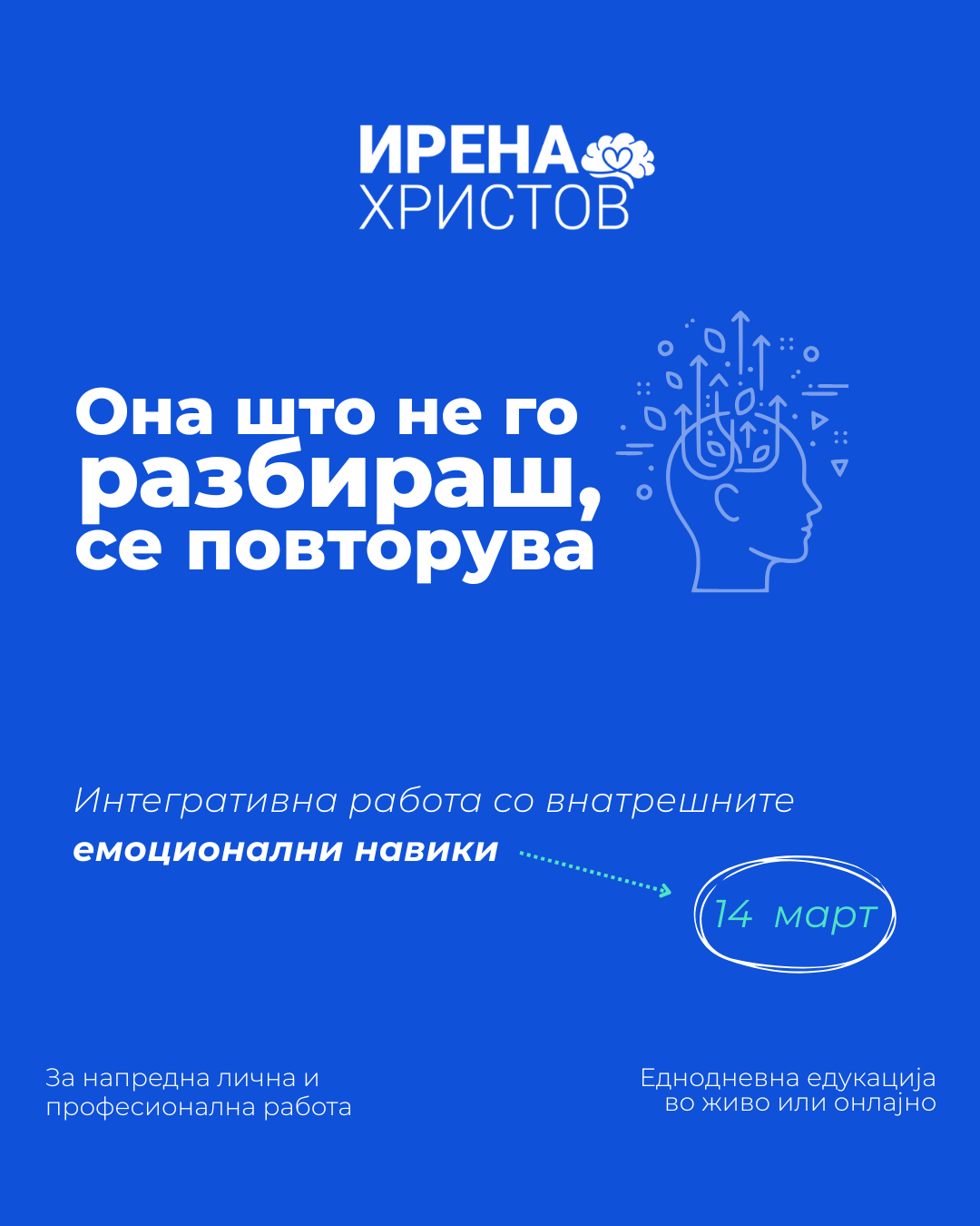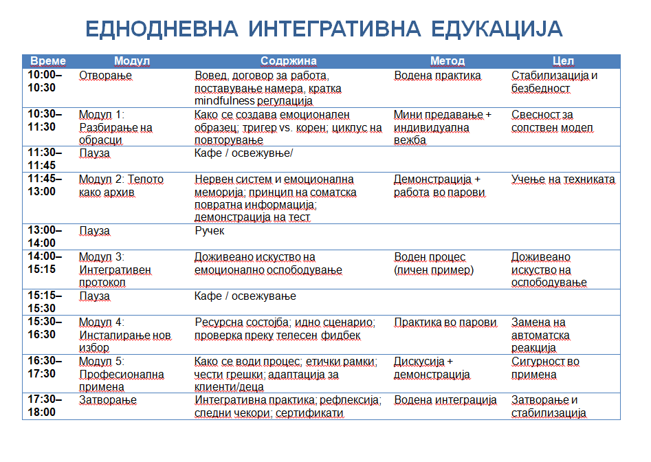 Оваа еднодневна едукација е посветена на препознавање, разбирање и ослободување на повторувачките емоционални обрасци – преку интегративен пристап што комбинира mindfulness, NLP и коучинг техники со авторска методологија за емоционално ослободување.